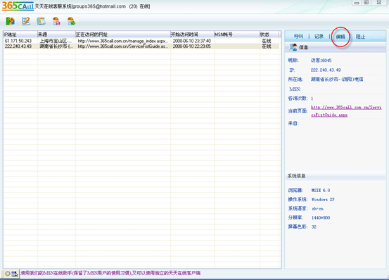 在kf000在線客服系統(tǒng)客服的監(jiān)控窗口,可選中一位訪客,點(diǎn)擊右邊的“編輯”按鈕: