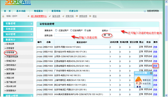 首先登陸網(wǎng)站,進(jìn)入管理中心,點(diǎn)擊“數(shù)據(jù)統(tǒng)計(jì)”->“訪客信息”,可根據(jù)訪客的IP和訪客名稱(chēng)進(jìn)行查詢(xún),點(diǎn)擊“查詢(xún)”:(已登記用戶(hù): ; 已咨詢(xún)用戶(hù):