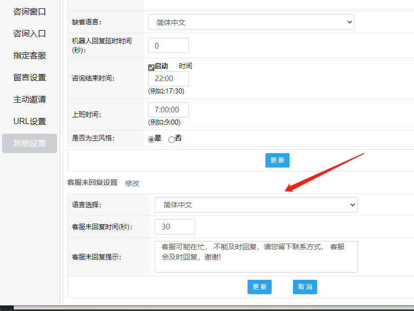 訪客可在客服休息時(shí)間或忙碌未及時(shí)回復(fù)時(shí)將自己的聯(lián)系方式留下,等待客服回呼解決問(wèn)題,可在“系統(tǒng)設(shè)置-媒體對(duì)接-網(wǎng)頁(yè)(網(wǎng)站)-設(shè)置-咨詢(xún)?nèi)肟凇?/span>